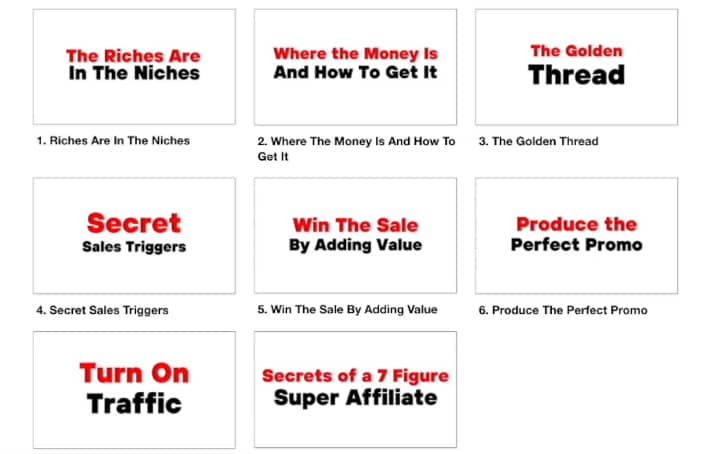 This program comes in 8 easy to follow modules. Each one is focused to bring you one step closer to getting to where you want to be as an affiliate and are as follows: