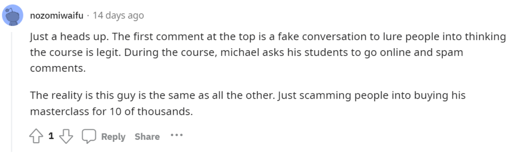 A student who enrolled in the program left a positive comment about BNB Investor Academy on Reddit.