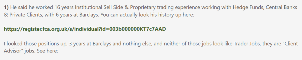 I also found this thread that questions his work experience at Barclays. In his own words, he has spent many years working for them as a trader, but according to the record files on him, Neerav Vadera has worked only 3 years as a client advisor, which has nothing to do with trading.