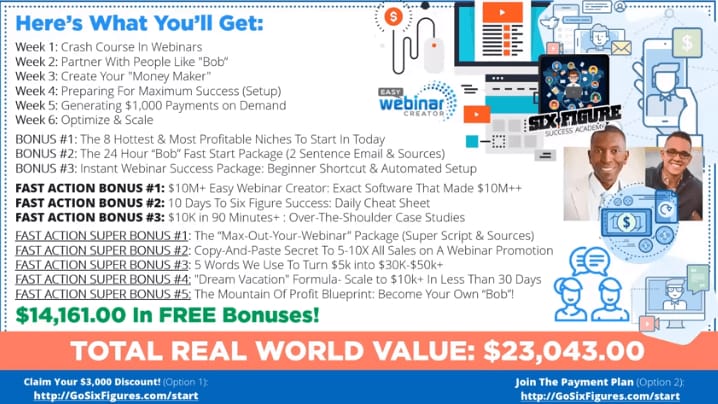 You will learn things like traffic (web users) generation from social media, setting up webinar funnels that can convert an audience into active buyers, and more. In my opinion, Six Figure Success Academy can be usefull to a lot of people that are just getting started.
